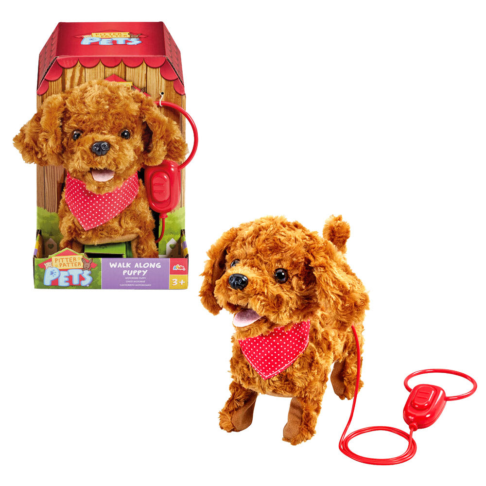 Este peluche interactivo Pitter Patter Pets cuenta con un mecanismo electrónico que permite que camine y emita sonidos de ladrido auténticos, diseñado para niños desde 3 años.